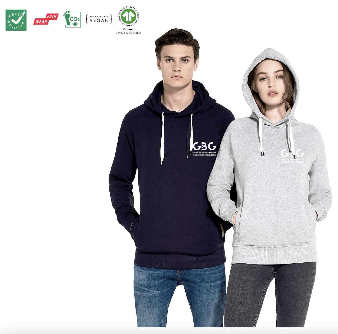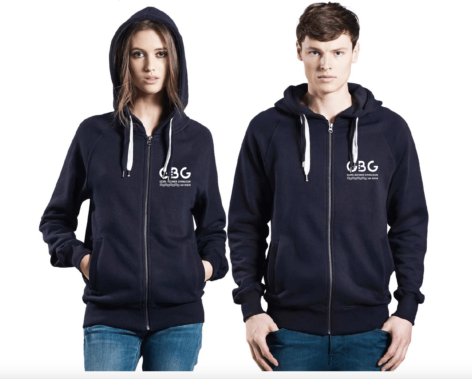 Gemeinsam mit allen Stakeholdern an der Schule haben wir das finale Design abgestimmt und die Kollektion dann mit T-Shirts, Hoodies und Zippern in den beiden Farben navy-blau und light-gray mit weißem Aufdruck gestartet. Auf der Vorderseite findet sich das neue Schullogo, auf der Rückseite unser Kürzel "GBG" mit dem Zusatz "Düsseldorf".