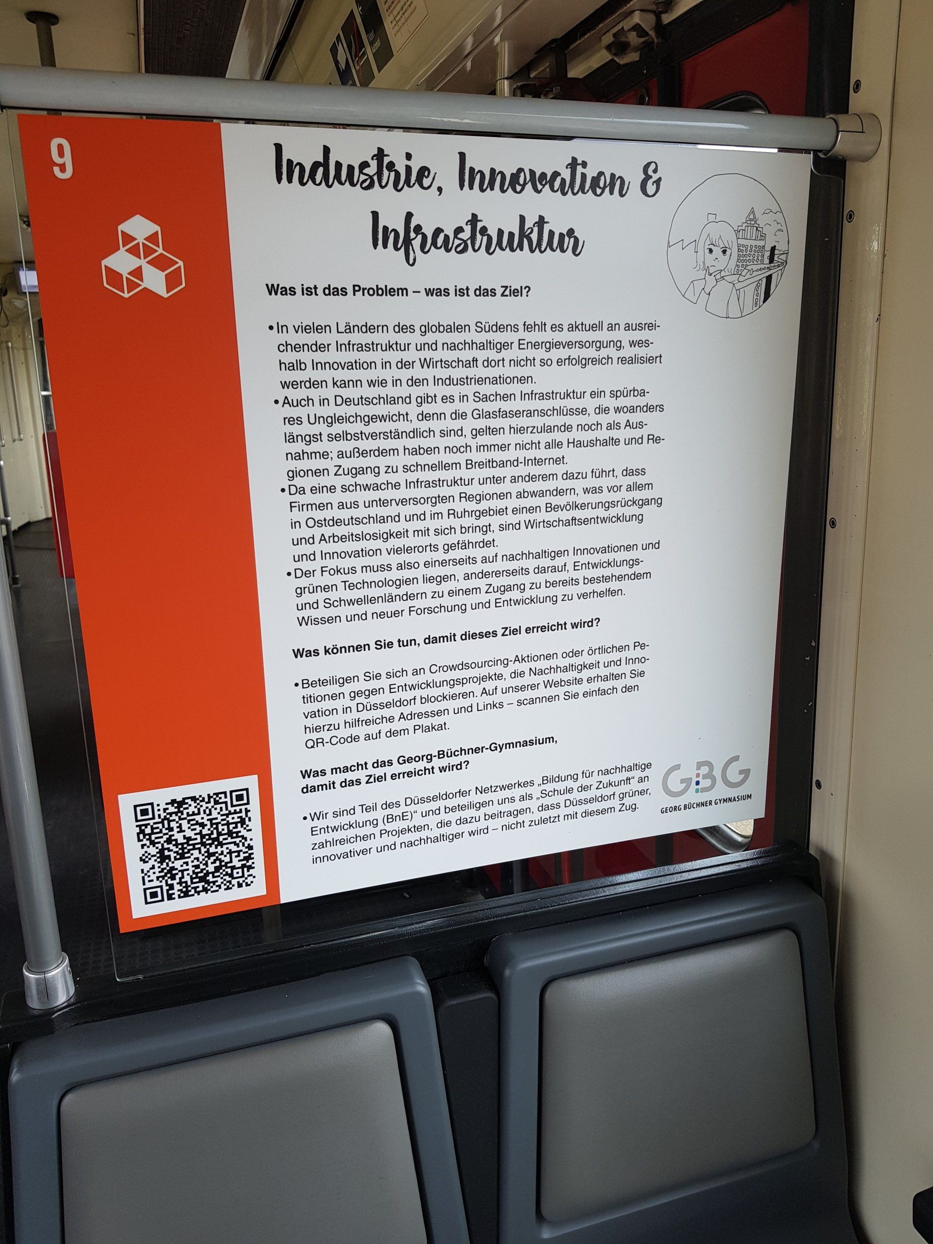 Dabei bedient die Bahn die Stadtbahn-Linien U74, U75, U76, U77, U78 und U79 und wird damit auch in Krefeld, Meerbusch, Neuss und Duisburg zu sehen sein. Dabei können sich die Fahrgäste von der Strahlkraft dieses Triebwagens und den wichtigen Nachhaltigkeitszielen außen ein Bild machen. Ebenso können sie in der Bahn erleben, was das jeweilige der 17 Ziele ausmacht, was jeder einzelne zur Erreichung dieses Ziels beitragen kann und was das Georg-Büchner-Gymnasium tut, um an dem Ziel zu arbeiten.